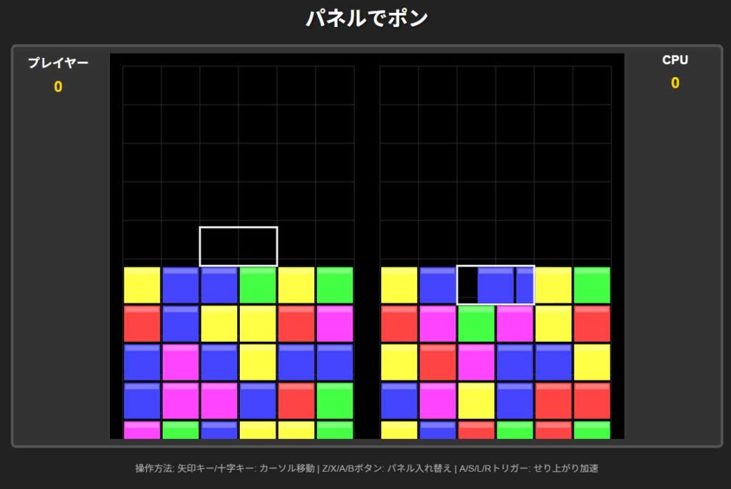 「パネルでポン」は、ターン制ではないのと、落下中のピースを利用したアクティブ連鎖などがあり、盤面の管理が難しいゲームです。※ 何も考えないとすぐバグる
